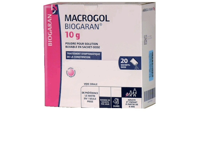 MACROGOL BIOGARAN 10 g est indiqué pour le traitement de la constipation chez l'adulte et l'enfant de plus de 8 ans.